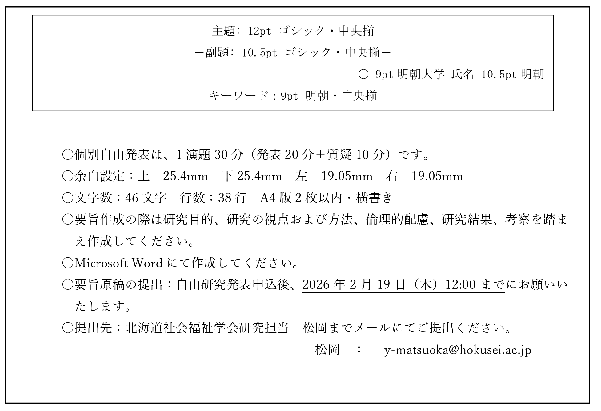 - 自由研究発表への申込資格は、日本社会福祉学会の会員または北海道社会福祉学会のB会員であることが要件となります。